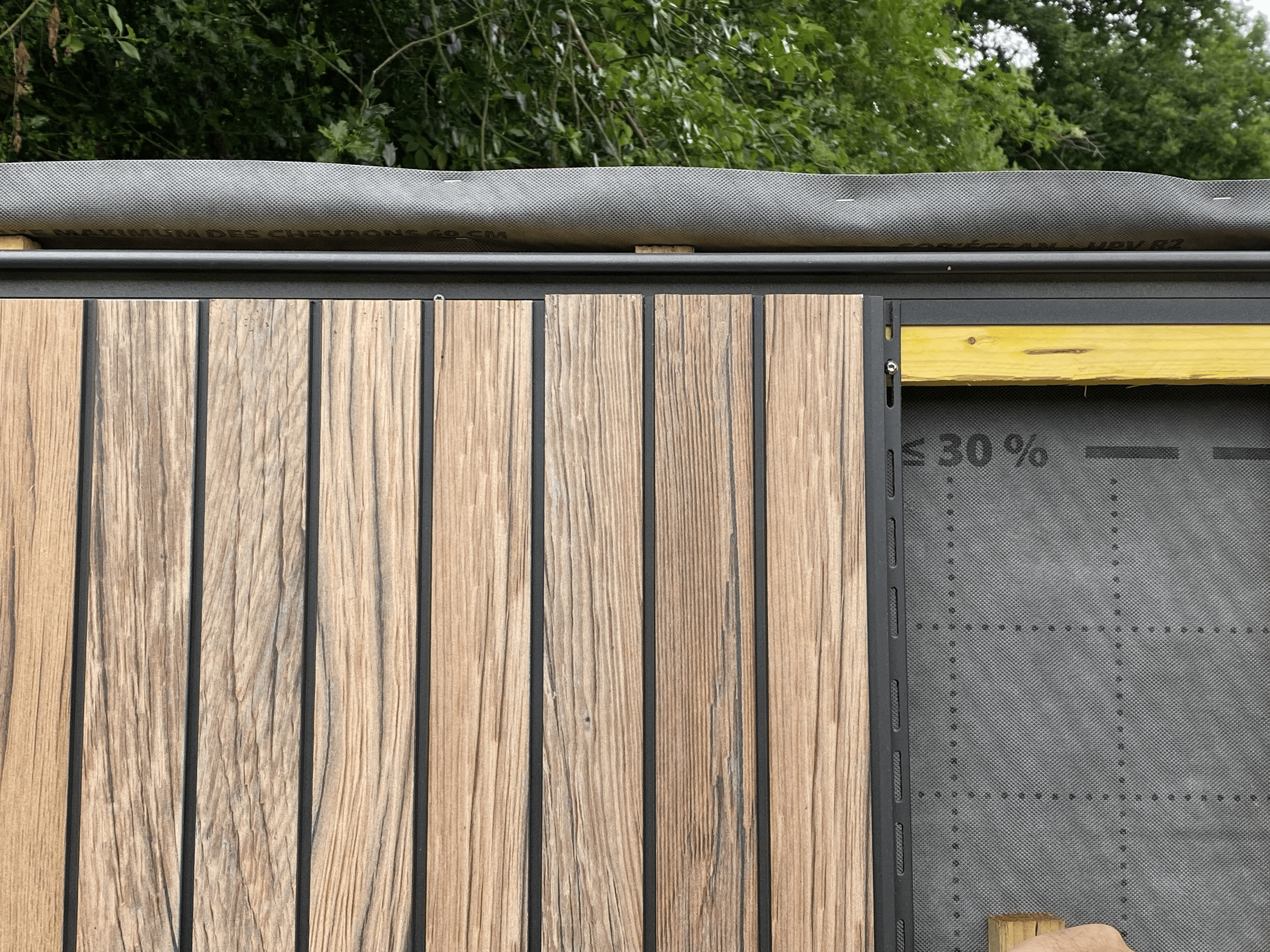 Les dernières étapes sont souvent celles qui font la différence. Les découpes ont été travaillées autour des ouvertures et avec les profilés de finition, le rendu net et moderne. Contrairement à d'autres matériaux, ce bardage est prêt à l’emploi dès sa pose, offrant une expérience de mise en œuvre simple et agréable.