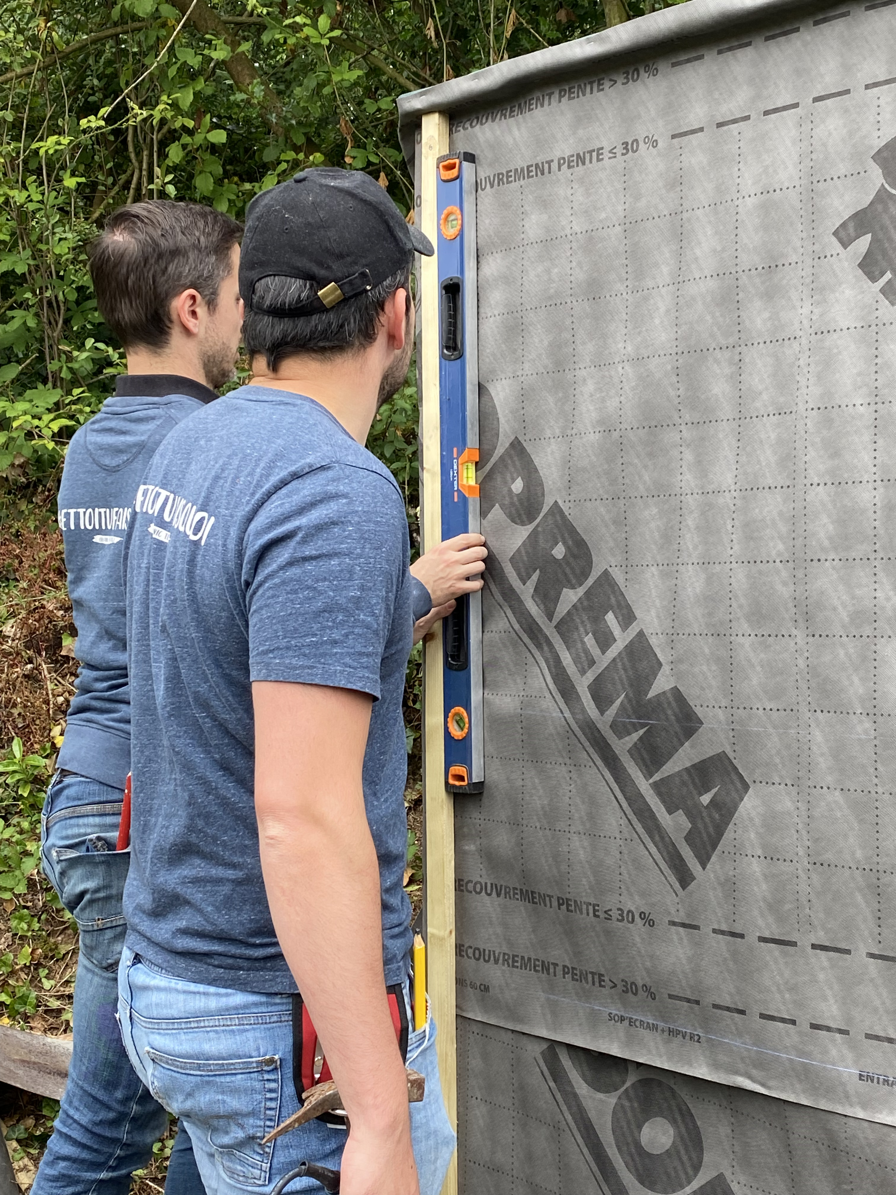 Pour fixer le bardage en format vertical, un double litonnage a été effectué. Cette sous-structure permet de ventiler le bardage et d'assurer son bon maintien dans le temps. Grâce à la légèreté des lames, les points d'ancrages sont simplifiés en vérifiant le niveau à chaque étape pour garantir un alignement parfait.
