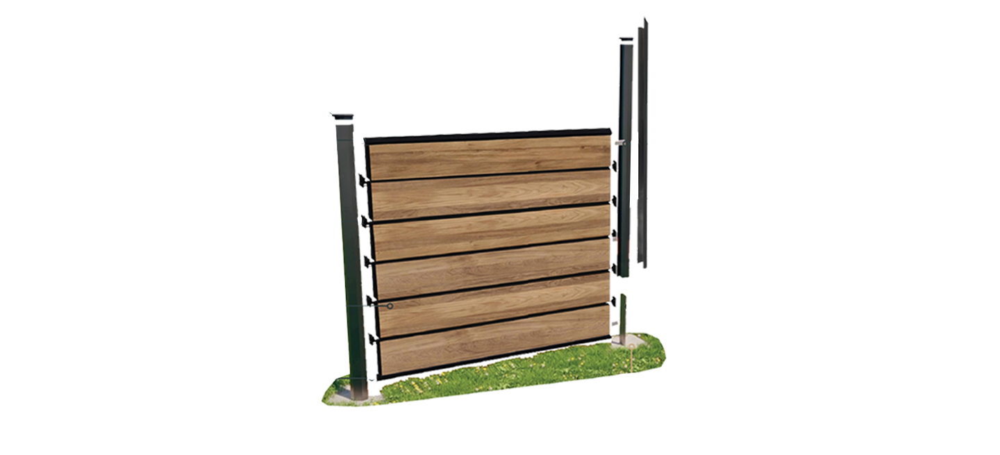 Les lames persiennes se posent panneau par panneau. Glissez chaque lame composite dans les poteaux ou cadres prévus en respectant :