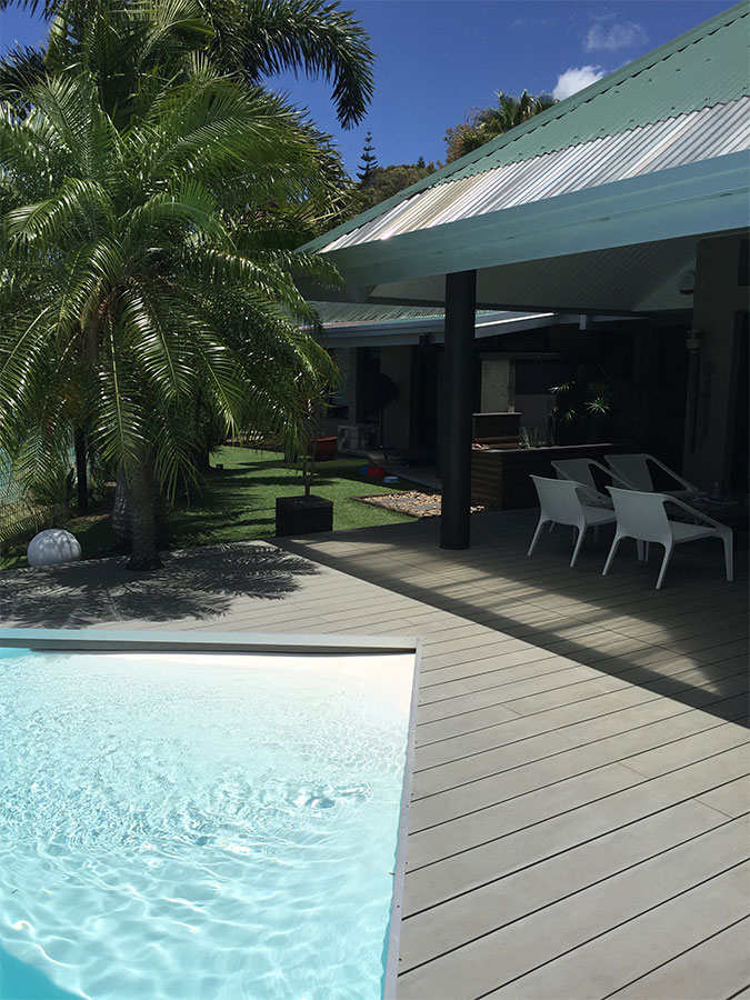 Le sol autour d'un bassin doit rester frais et non glissant. Les platelages composites en ton clair sont parfaits comme sol pour les terrasses en étant pieds nus. Ils assurent confort et sécurité même par grande chaleur.
