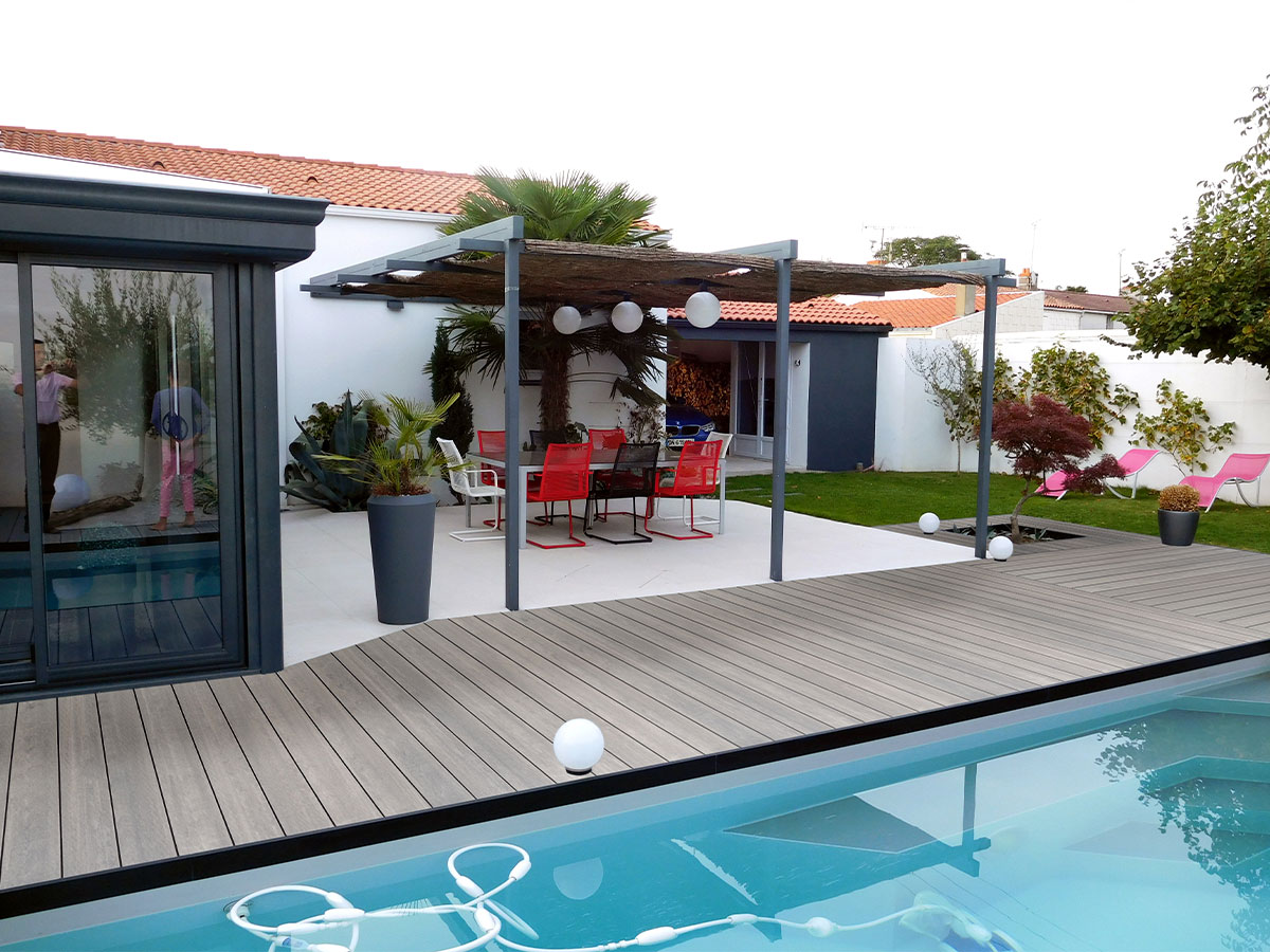 Pour un ensemble harmonieux, associez des matériaux contemporains aux structures d’ombrage : l’aluminium et le composite par exemple. Une terrasse composite avec des lames grises permet d’obtenir une finition texturée, chic et antidérapante.