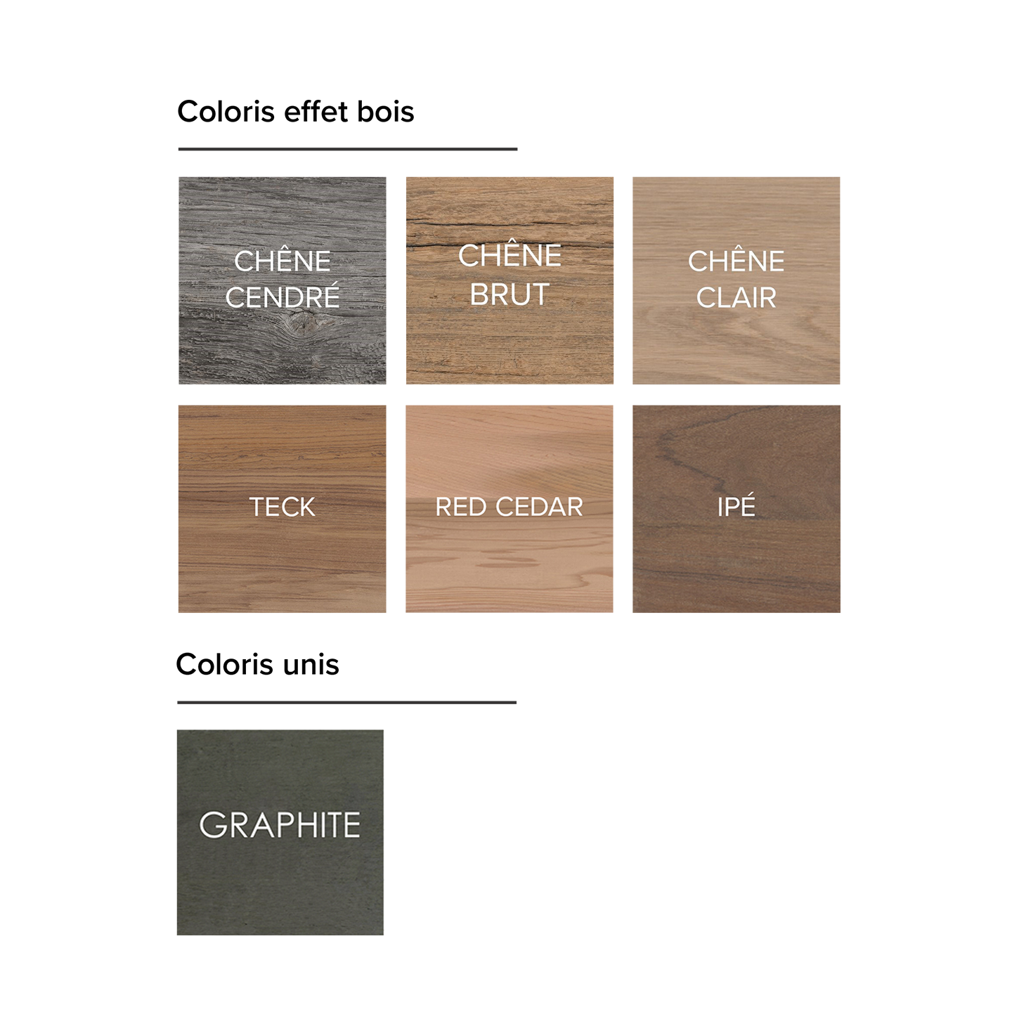 La persienne Océwood se décline en six coloris effet bois fidèles aux nuances naturelles, ainsi qu’en coloris graphite, idéal pour s’accorder à tous les extérieurs.