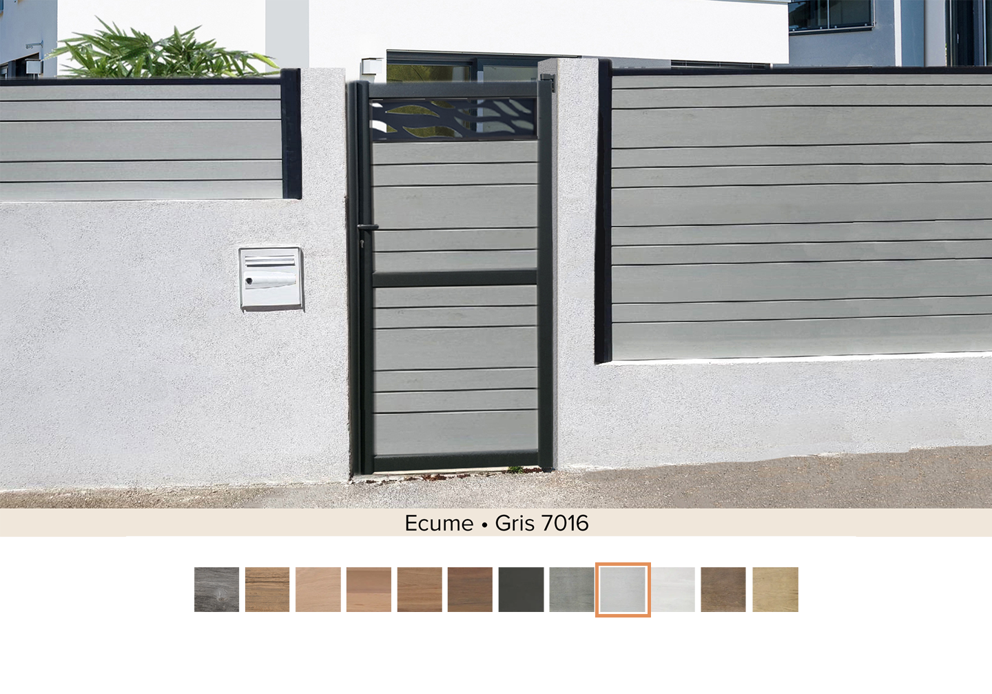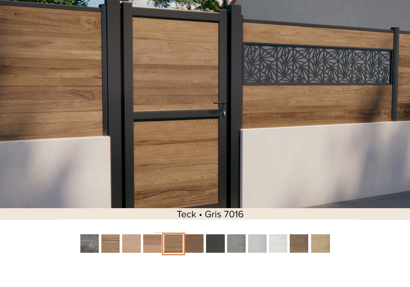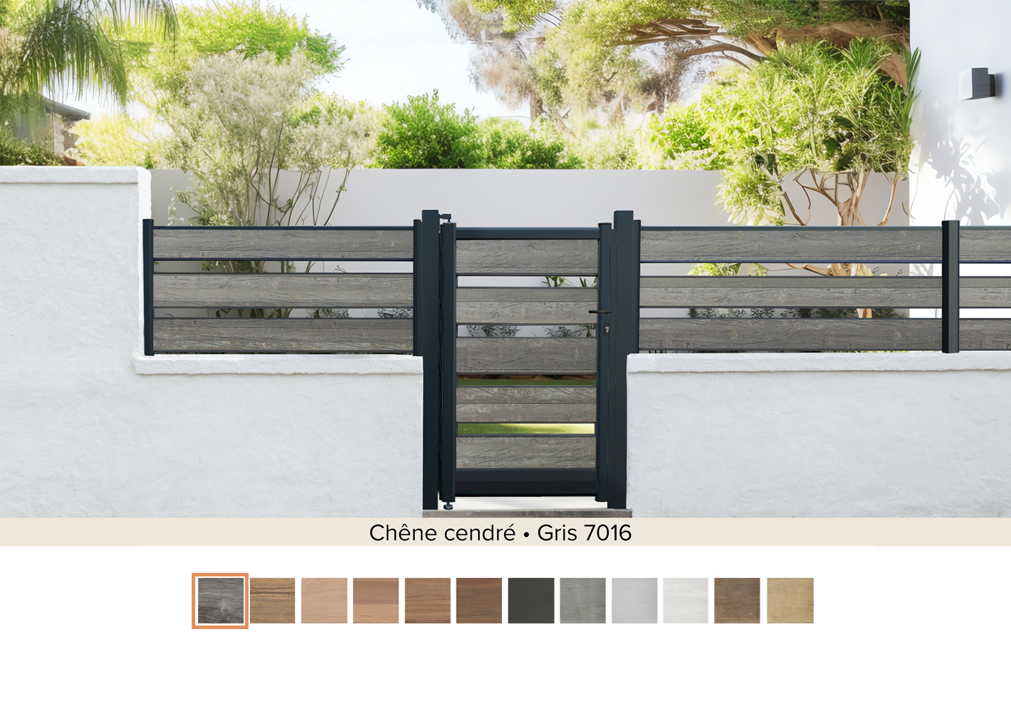 Plus qu’un simple accès, notre portillon est pensé comme une véritable extension harmonieuse de votre aménagement extérieur. Fabriqué en composite recyclé avec un cadre en aluminium, il combine esthétisme, robustesse et praticité au quotidien. Disponible en teintes unies modernes ou avec notre finition esthétique bois Tech·Sture®, il s’intègre naturellement à tous les styles d’habitat, du plus contemporain au plus chaleureux.