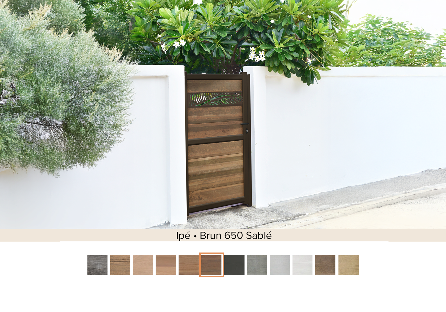 Le portillon Océwood® devient une véritable signature esthétique pour vos extérieurs. Trois formats sont disponibles pour répondre à toutes vos envies : le portillon plein, qui garantit une intimité totale, le portillon ajouré, disponible avec différents espacements pour une prise au vent réduite et le portillon décoratif, rehaussé d’une lame aluminium qui ajoute une touche contemporaine et élégante à votre jardin.